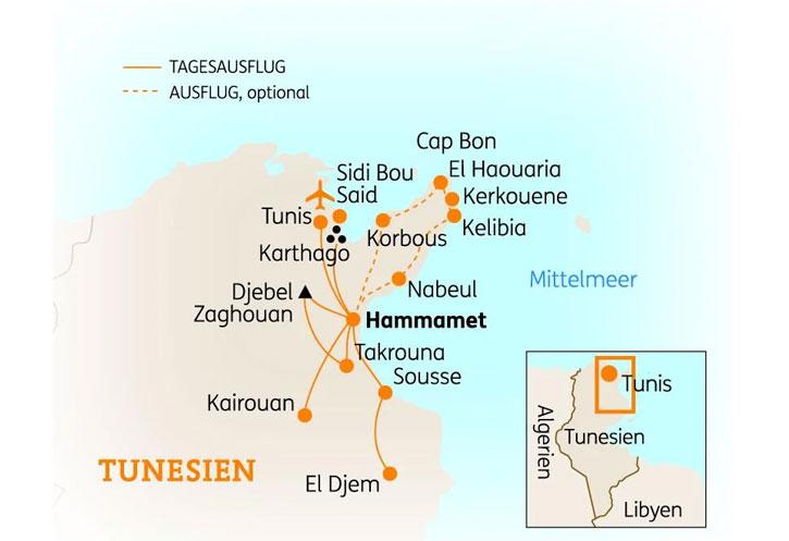 Erleben Sie bei dieser 8-tägigen Standortreise eine optimale Kombination aus Kultur und Erholung. Lassen Sie sich von der faszinierenden Geschichte und Kultur Tunesiens verführen und freuen Sie sich auf die Gastfreundschaft der Tunesier. Genießen Sie den Komfort einer Erlebnisreise mit Aufenthalt in nur einem Hotel und entspannen Sie nach Ihren Ausflügen und Besichtigungen in Ihrer schönen 5-Sterne-Anlage am Strand von Hammamet.
