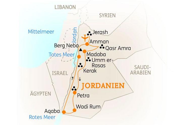 Entdecken Sie auf dieser 11-tägigen Rundreise die Höhepunkte des haschemitischen Königsreichs! Lassen Sie sich von der faszinierenden Geschichte und Kultur verführen und freuen Sie sich auf die weltberühmte Felsenstadt Petra. Wüstenlandschaft und Felsformationen im Wadi Rum werden Sie ebenso in den Bann ziehen wie das Bad im Toten Meer oder das Glitzern des Roten Meeres. Verbringen Sie außerdem eine Nacht in einem Wüstencamp unter dem funkelnden Sternenhimmel!