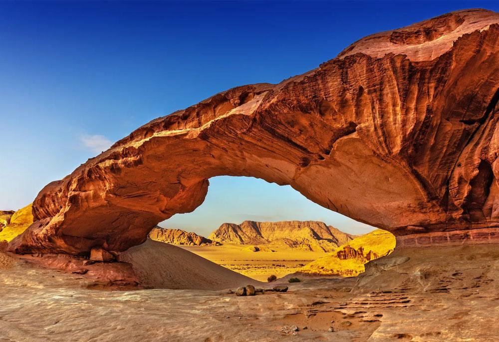 Mittags setzen Sie Ihre Reise in den tiefen Süden Jordaniens fort. Es wartet ein weiterer Reisehöhepunkt auf Sie: die Wüste Wadi Rum (UNESCO Weltnaturerbe)! Die weitläufige Wüstenlandschaft wurde schon als Kulisse für viele Hollywoodproduktionen genutzt. Das Wadi ist die größte und schönste Wüstenlandschaft in Jordanien. Von Erosion kunstvoll geschliffene, bizarre Sandstein- und Granitfelsen, die je nach Tageszeit in gelben, roten und orangefarbenen Tönen schimmern, prägen diese malerische Landschaft. Erleben Sie diese faszinierende Szenerie bei einer Geländewagentour (ca. 2 Std.) und entdecken Sie beispielsweise die Lawrence-Quelle oder den Khazali-Canyon oder aber auch die ganz eigenen Lieblingsplätze Ihrer Reiseleitung. Genießen Sie die Tour und vertreten Sie sich bei verschiedenen Fotostopps die Füße, bevor die Sonne in spektakulären Rot- und Orangetönen über der Wüste untergeht. In Ihrem Wüstencamp erwartet Sie ein wohlverdientes Abendessen sowie einen funkelnder Sternenhimmel. Freuen Sie sich auf eine traditionell beduinische Mahlzeit, die in einem speziellen Ofen im Wüstensand zubereitet wurde. 1 Nacht in einem Wüstencamp. (F/A)