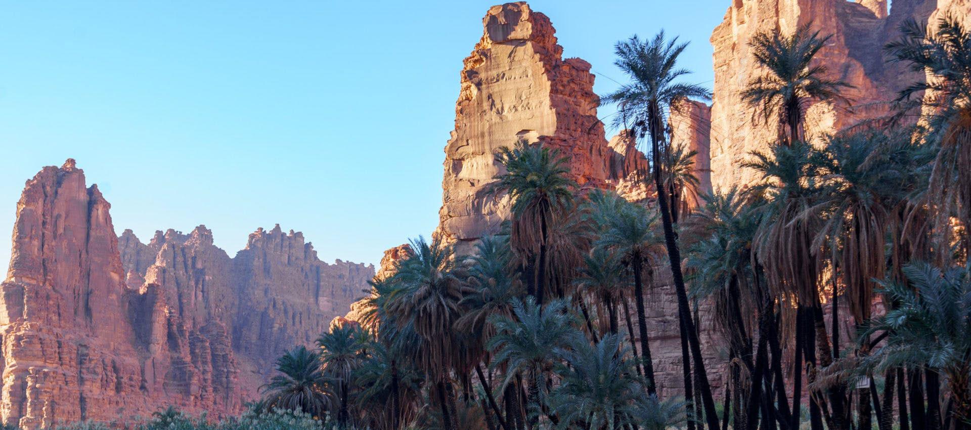 Wadi Disah, 260 km nördlich von Tabuk, ist ein unberührtes Tal im Prince Mohammed Bin Salman Naturschutzgebiet. Die Landschaft ist geprägt von hohen Steilhängen, klaren Bächen und üppiger Vegetation, dank unterirdischer Quellen.