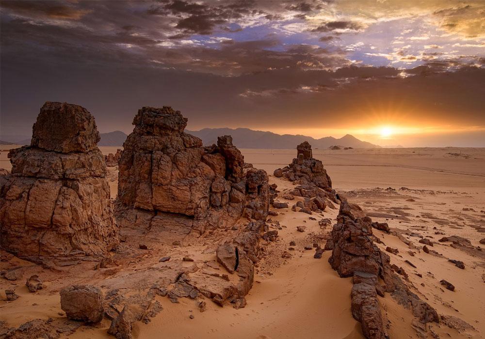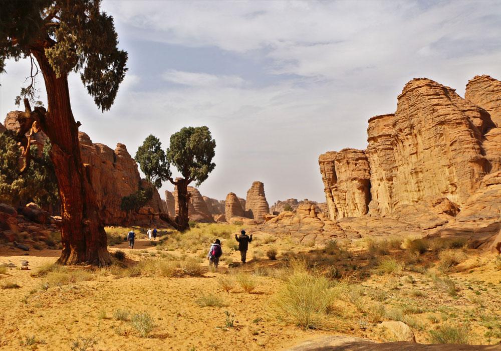 Diese seltsame Mondlandschaft von großem geologischen Interesse beherbergt eine der bedeutendsten Sammlungen prähistorischer Felskunst der Welt. Mehr als 15.000 Zeichnungen und Stiche ermöglichen uns eine Nachverfolgung seit 6000 v. Chr. Chr. bis in die ersten Jahrhunderte n. Chr., Klimaveränderungen, Tierwanderungen und die Entwicklung des menschlichen Lebens an den Grenzen der Sahara. Von besonderem Interesse ist das Panorama der geologischen Formationen mit seinen „Felswäldern“ aus erodiertem Sandstein.