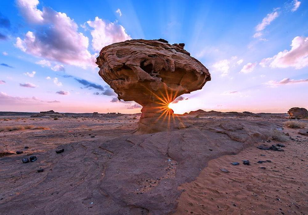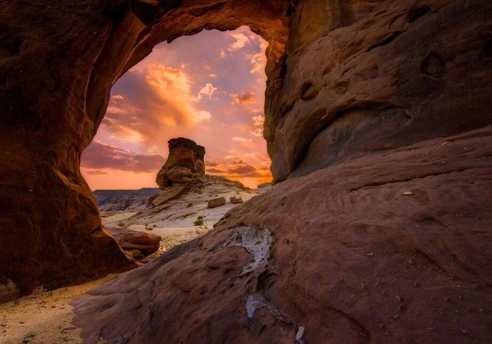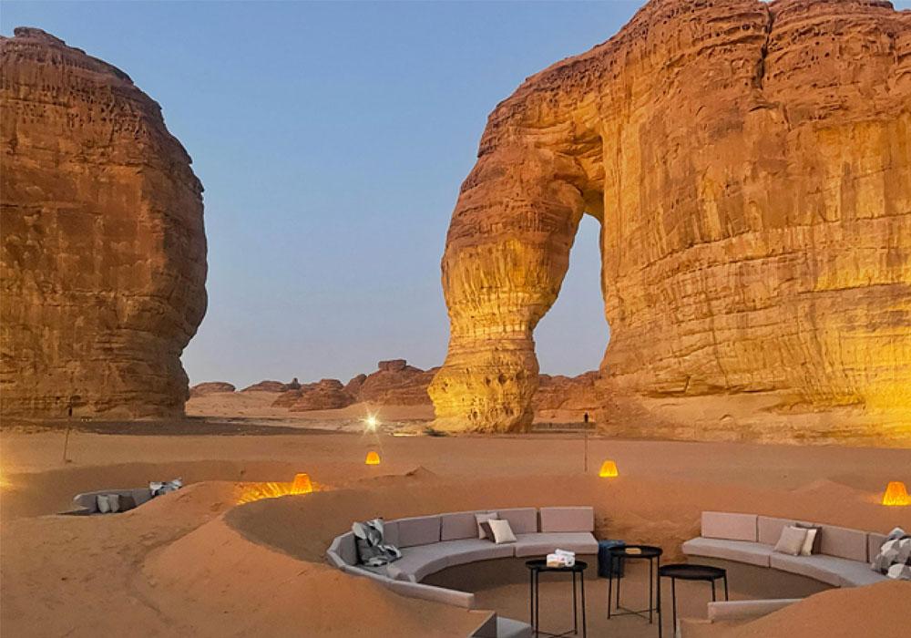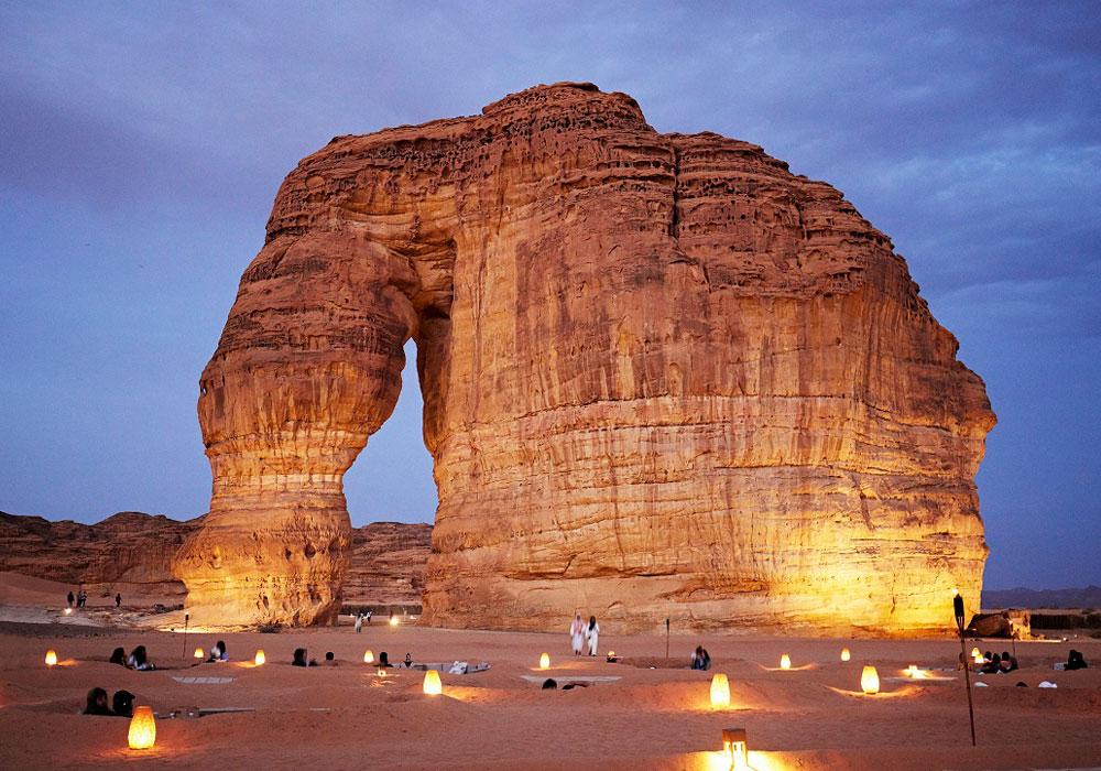 Die Oase von AlUla, gespeist von 80 natürlichen Quellen, ermöglicht üppige Vegetation und den Anbau von Datteln, Zitrusfrüchten, Weizen und Feigen. Die umgebenden Sandsteinberge bieten faszinierende Formationen, wie den Elephant Rock, der bei Sonnenuntergang besonders beeindruckend ist.
