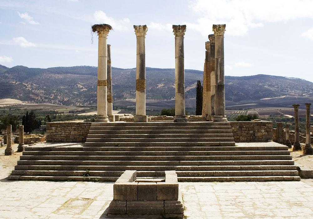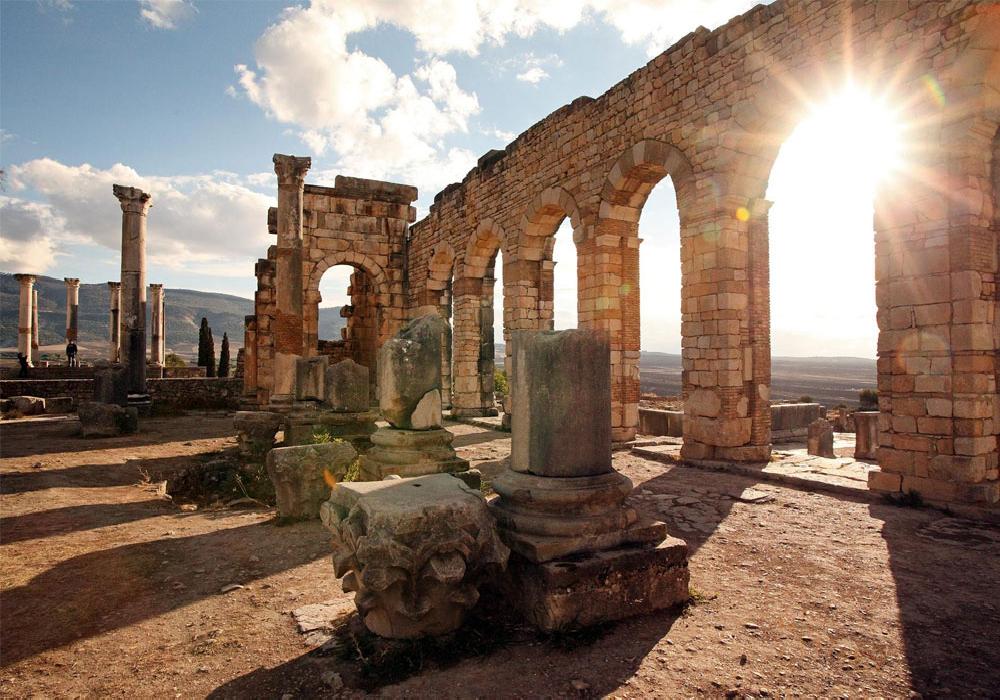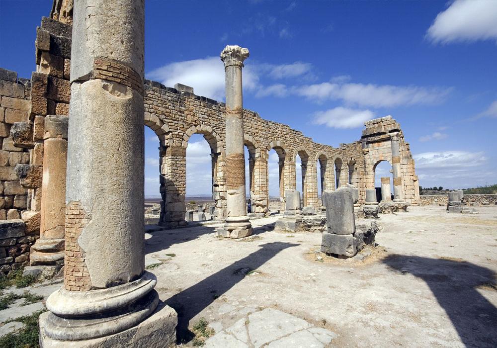 Volubilis, nahe Meknès, war eine wichtige römische Stadt und ist heute UNESCO-Weltkulturerbe. Gegründet um 25 v. Chr., war die Stadt ein Zentrum für den Handel mit Olivenöl und Korn. Trotz der Zerstörung durch ein Erdbeben 1755 sind zahlreiche Gebäude erhalten und bieten Einblick in das Leben während der römischen Herrschaft.