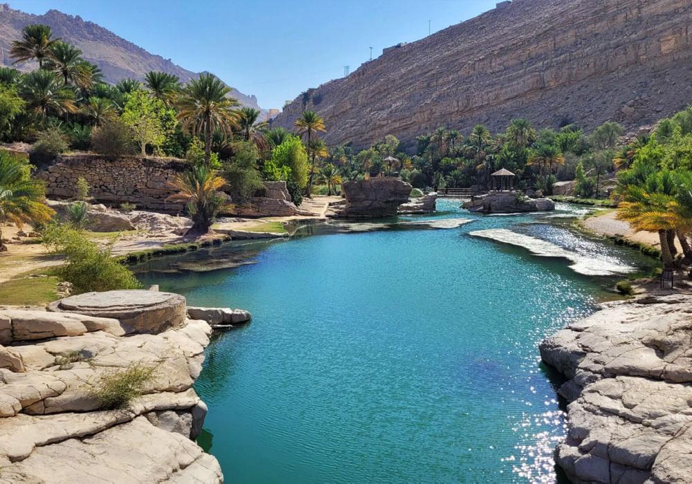 Wadi Bani Khalid ist eine der bekanntesten Oasen im Oman, etwa 200 km südlich von Maskat. Eingebettet in das Hadschar-Gebirge nahe der Wahiba-Wüste, beeindruckt das Wadi durch seine Süßwasserpools, Palmen und eine artenreiche Flora und Fauna. Besonders sehenswert ist die Muqhal-Höhle, die Besucher mit einer Taschenlampe erkunden können. Viermal jährlich verwandelt sich das Wadi von einem ruhigen Ort in einen reißenden Strom, was ein beeindruckendes Naturschauspiel bietet. Sowohl Touristen als auch Einheimische schätzen das Wadi als Naherholungsgebiet und idealen Ort für Picknicks und Erholung.